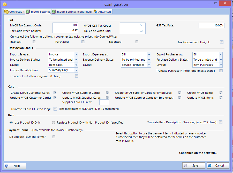 Update MYOB Items | If enabled, items will be updated in MYOB when exporting invoices or purchases to reflect any changes made to the product in Connectwise. |