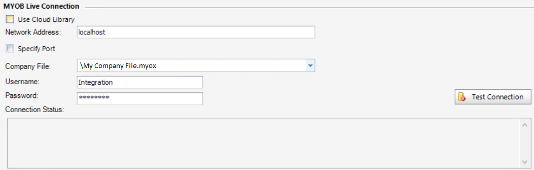 Network address and port number | This is available if using a local file (if the Use Cloud Library box is unticked). Enter the server name or IP address of your MYOB server. The MYOB server uses port 8080 by default, but if different then tick the Specify Port box to indicate the port number. |