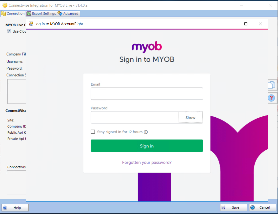 Use this tab to enter the credentials to both MYOB AccountRight and Connectwise Manage.