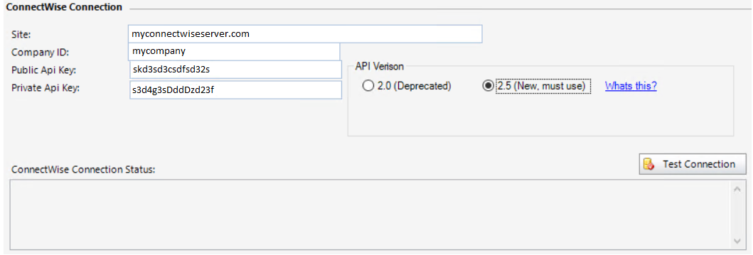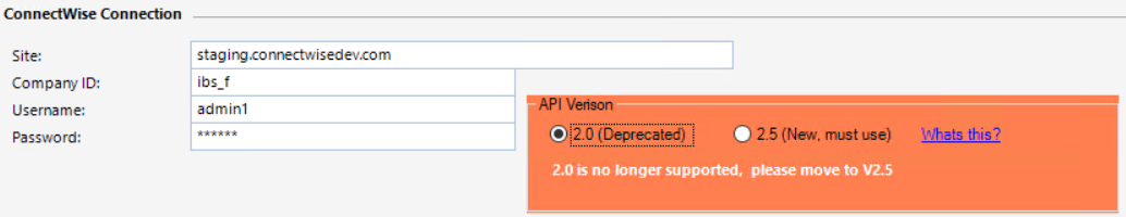 | API Version | This is the version of the Connectwise API. You must select version 2.5. Version 2.0 is deprecated and will be retired by Connectwise at some stage. |