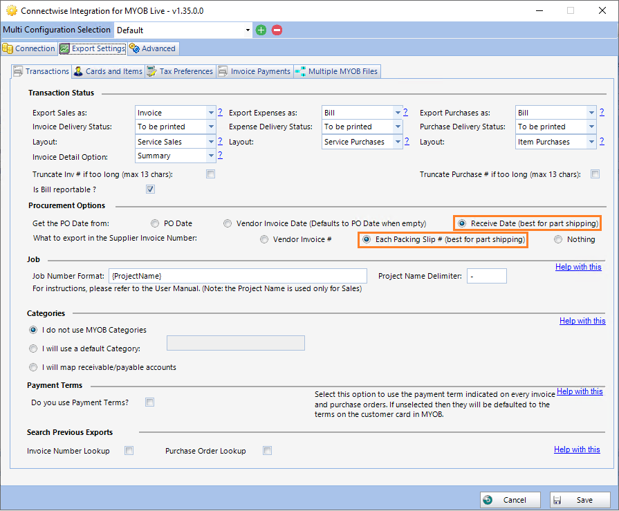 To ensure that each shipment from an order is properly identified in MYOB, please make sure you adjust the following preference in the Configuration panel of the integration tool.