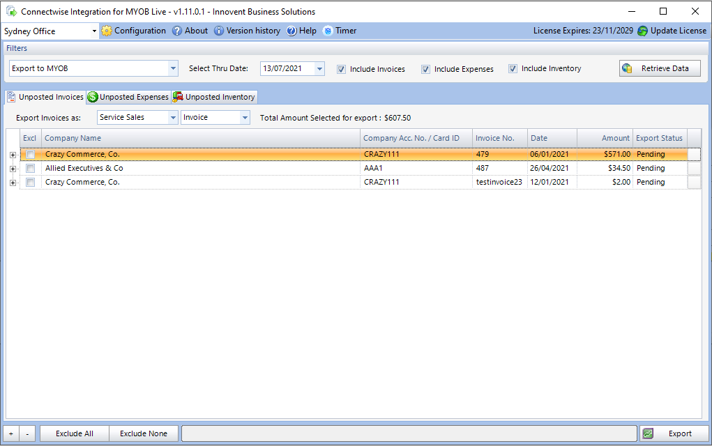 This way, when you run the export, every time you change the company selector you will see transactions (invoices, expenses and purchases) coming from the Connectwise site corresponding to that company. Then simply export as normal and these transactions will go into the designated MYOB file.